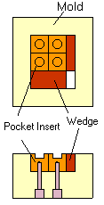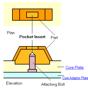 A pocket insert is generally used when the shape of the part is square. A pocket insert is attached to the mold by an attaching bolt, as shown below..