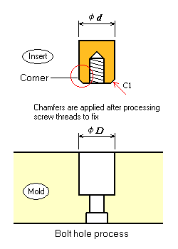 When making an insert or a mold, chamfers are applied to its corners. The corners can not be processed at a right angle due to the edge R of cutware or relief of cutware, even when an insert or a mold is made accurately as measured. If an insert is attached to a mold without chamfering, the corner will interfere and prevent the insert from being attached at the proper position. Also, an excessive gap between an insert and a mold will cause part defects. Therefore, be sure to fulfill the matching requirement (positional tolerance of hole and axis) that is regulated by the Japanese Industrial Standard (JIS).