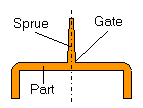 A sprue is a channel through which to transfer molten plastics injected from the injector nozzle into the mold. It is a part of sprue bush, which is a separate part from the mold.
