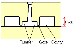 The molten plastics injected from the injector nozzle will go through a sprue (sprue bush), a runner, and a gate and fill up in the cavity. As the temperature of molten plastics is lowered while going through the sprue and runner, the viscosity will rise; therefore, the viscosity is lowered by shear heat generated when going through the gate to fill the cavity.
