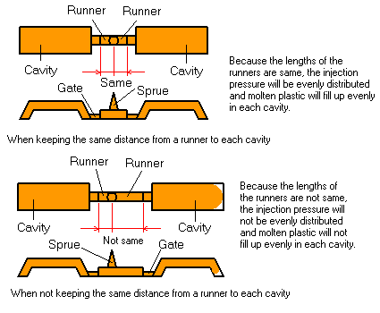 Keep the same distance from a runner to each cavity when molding multiple parts . By doing so, injection pressure will be evenly distributed and molten plastics will fill up evenly in each cavity..
