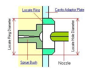 At this point, the center bores of the sprue bush and the nozzle must be aligned so that the high pressured molten plastics will not leak.