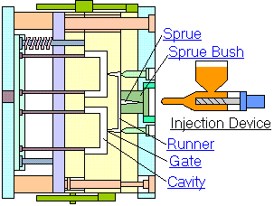 The high pressured molten plastics injected from the nozzle of the molding machine is injected into the cavity through the sprue bush.