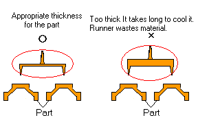 The thickness of runner is determined based on the material or shape of parts. If a runner is too big, cooling solidification will take too much time and molding cycle will be longer. Also, a large runner wastes the molding material , thus raising the cost. On the other hand, too small of a runner would cause molding defects such as short shot or sink mark, adversely affecting the quality of parts.