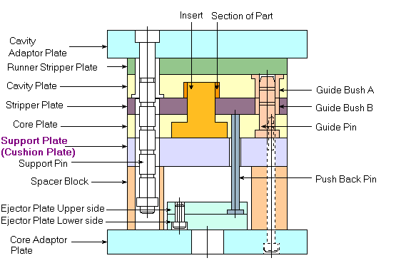 One of the plate parts of a mold. It is installed on the back (or bottom) of a core plate. It installs and fixes a female or male mold, other guide pins, or a bush.