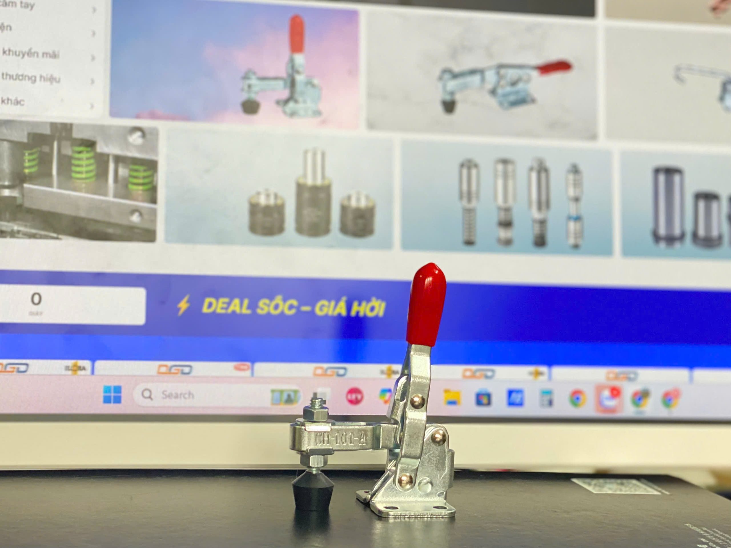 The CH-101-A toggle clamp is a quick-release clamp with a vertical jaw, used in jig and fixture systems and manufacturing workshops.