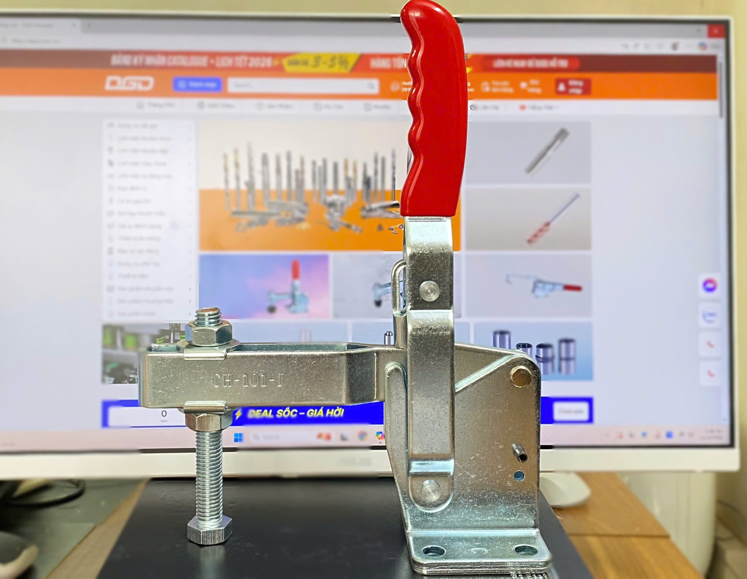 CH-101J toggle clamp is a quick-release clamp with a vertical jaw, used in jig and fixture systems and manufacturing workshops.