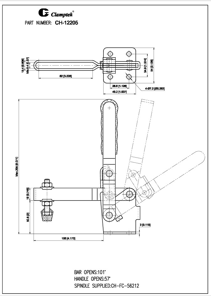 CH-12205 toggle clamp is a quick-release clamp with a vertical jaw, used in jig and fixture systems and manufacturing workshops.