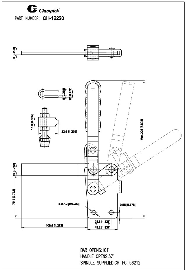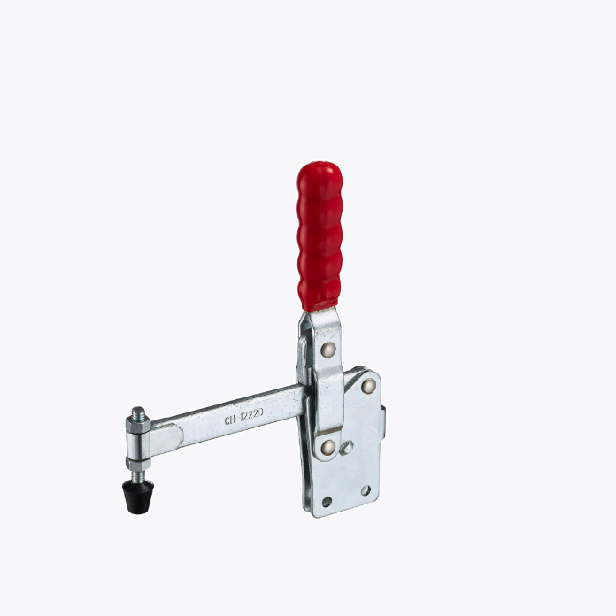 CH-12220 toggle clamp is a quick-release clamp with a vertical jaw, used in jig and fixture systems and manufacturing workshops.