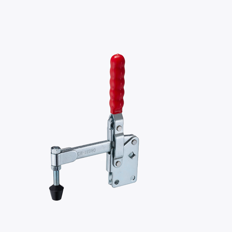 CH-12280 toggle clamp is a quick-release clamp with a vertical jaw, used in jig and fixture systems and manufacturing workshops.