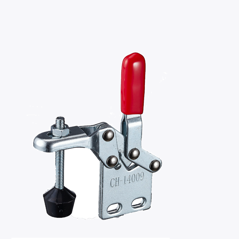 CH-14009 toggle clamp is a quick-release clamp with a vertical jaw, used in jig and fixture systems and manufacturing workshops.