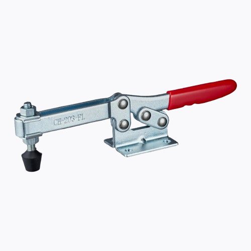 The CH-203-FL toggle clamp, from the Taiwanese brand Clamptek, is a quick-release clamp with horizontal jaws parallel to the clamping direction. The clamping force is adjusted by actuating the quick-release handle. This clamp is used in jig and fixture systems and in manufacturing workshops.