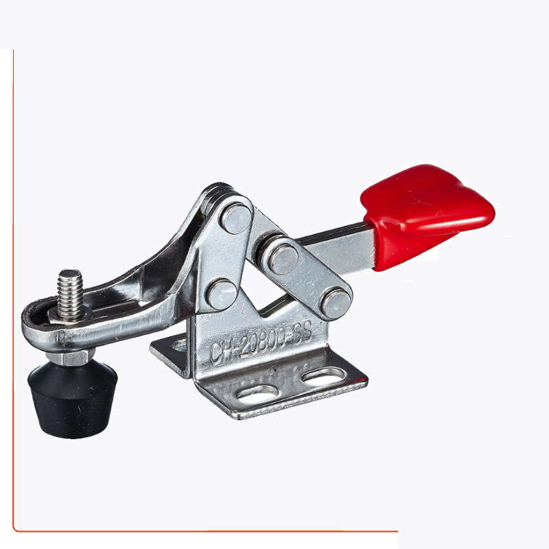 The CH20800-SS stainless steel toggle clamp, originating from Taiwan, is a quick-release clamp with a horizontal jaw, used in jig and fixture systems.