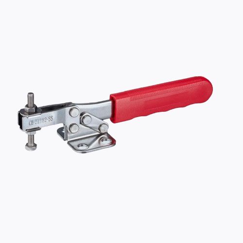 CH-21382-SS toggle clamp, from the Taiwanese brand Clamptek, is a quick-release clamp with horizontal jaws parallel to the clamping direction. The clamping force is adjusted by actuating the quick-release handle. This clamp is used in jig and fixture systems and in manufacturing workshops.