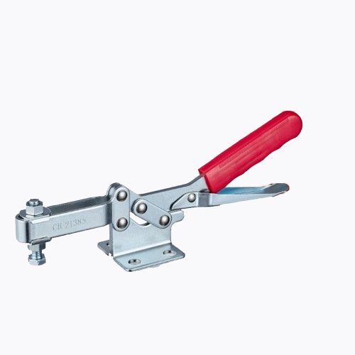 CH-21385 toggle clamp, from the Taiwanese brand Clamptek, is a quick-release clamp with horizontal jaws parallel to the clamping direction. The clamping force is adjusted by actuating the quick-release handle. This clamp is used in jig and fixture systems and in manufacturing workshops