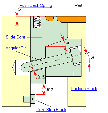 The locking block installed to the cavity plate receives the pressure from the injection when closing the mold. Upon opening of the mold, the slide core moves backward by the force from the angular pin and the spring, thus releasing the part.