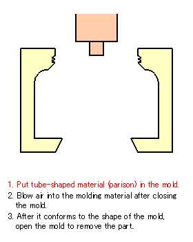 1) Đặt vật liệu dạng ống vào khuôn 2) Thổi không khí vào 3) Hoàn thành