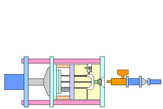 射出装置を前進させて、金型の取付位置が合っているかどうか、射出装置のノズルをロケートリングにタッチさせます。