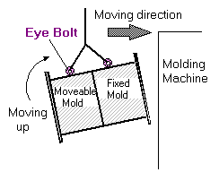 Dây cẩu được nối vào bu lông vào khi di chuyển khuôn vào trong máy ép nhựa. Nên thiết kế làm sao cho tấm khuôn bên động thấp hơn một ít so với tấm bên cố định. Bởi vì khuôn được lắp ráp từ phía bề mặt bên cố định trước và khi đó tấm cố định có thể điều chỉnh với máy nhựa tốt hơn.