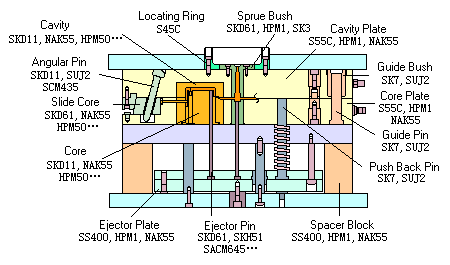Dưới đây là các mác thép thường được sử dụng làm khuôn, tùy từng tính năng của các bộ phận trên khuôn mà có vật liệu phù hợp. Ngoài ra có một vài chi tiết có độ cứng đặc biệt và phải dùng vật liệu nhiệt luyện được.
