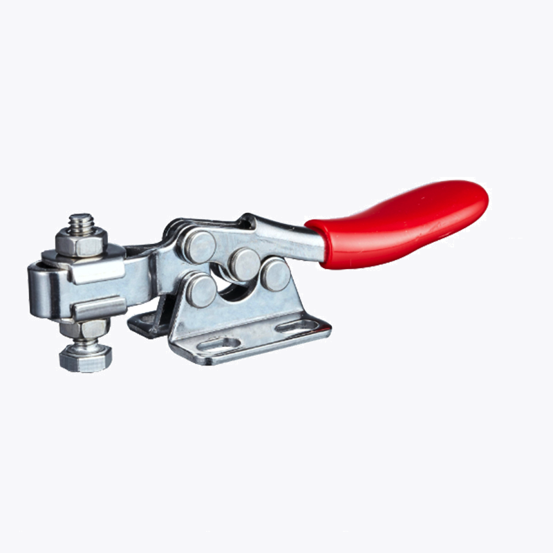 The CH-201-SS toggle clamp, from the Taiwanese brand Clamptek, is a quick-release clamp with horizontal jaws parallel to the clamping direction. The clamping force is adjusted by actuating the quick-release handle. This clamp is used in jig and fixture systems and in manufacturing workshop