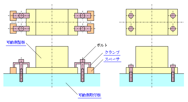 Ở Hình bên phải là phương pháp gắn bu lông trực tiếp lên máy ép nhưng. Trong khi thiết kế, lỗ bu lông trên tấm kẹp bên phía cavity, tấm kẹp bên Core phải xác nhận kích thước và vị trí.