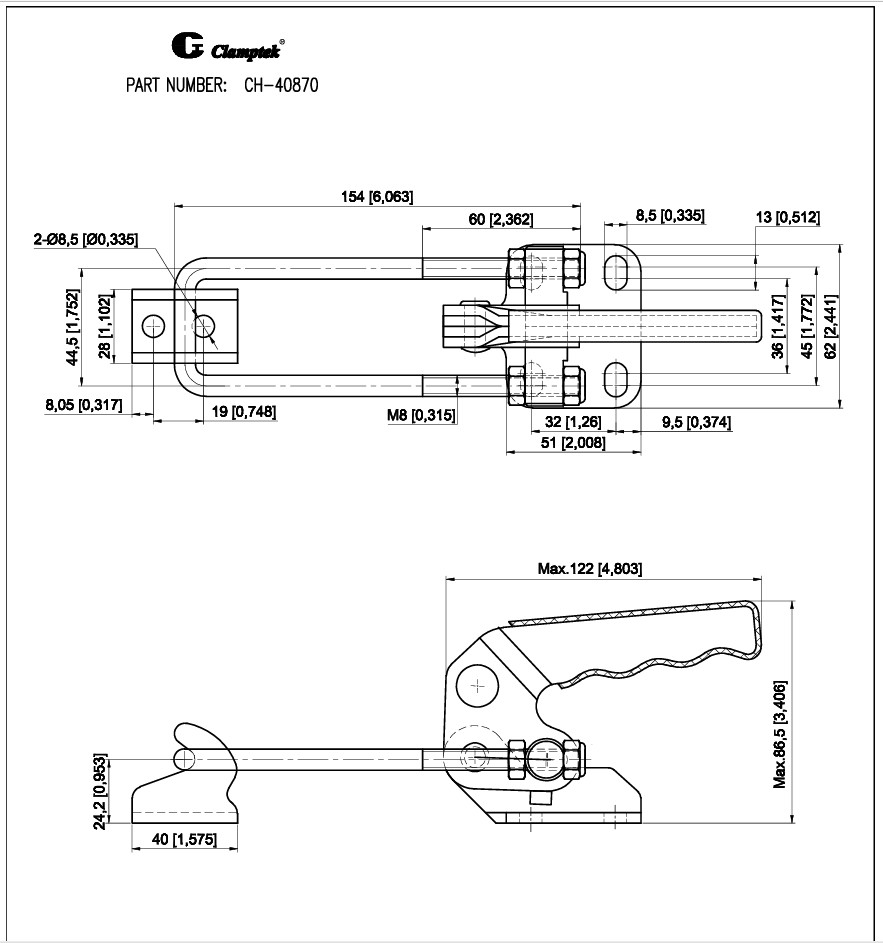 Kẹp định vị CH-40870 thương hiệu clamptek Đài Loan, là dạng kẹp chốt nhanh với mỏ kẹp nằm dạng móc, chuyển đổi lực kẹp nhờ tác động vào tay kẹp nhanh, Kẹp được sử dụng trong hệ thống máy móc jig đồ gá, xưởng sản xuất.