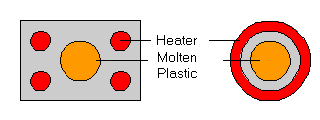 Để làm nóng chảy vật liệu đúc, nhựa thường được làm chảy dẻo thường xuyên trong xi lanh phun. Tuy nhiên, khuôn không rãnh dẫn áp dụng phương pháp thay thế rãnh dẫn nhựa nóng, nó làm tan chảy vật liệu bằng bộ gia nhiệt (hot runner). Rãnh dẫn nóng có 2 loại: Kiểu nung nóng bên trong dùng để nung nóng vật liệu từ trong họng phun phụ, và kiểu nung nóng từ bên ngoài để nung nóng vật liệu từ ngoài họng phun phụ từ ngoài họng phun phụ, như hình bên dưới.