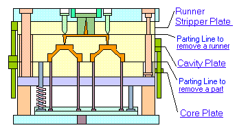 Khuôn ba tấm có hai Mặt phân khuôn (PL: Nơi mà khuôn được chia) một để tháo rãnh dẫn và một để tháo sản phẩm, nó gồm ba phần: Tấm cố định, tấm di động, và tấm để tháo rãnh dẫn nhựa.