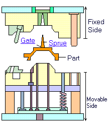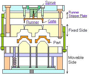 – Bạc cuống phun: Nơi mà nhựa nóng được phun vào khuôn. Rãnh dẫn: Là kênh để truyền nhựa nóng chảy từ bạc cuống phun tới cổng phun. Cổng phun: Là miệng phun nhụa vào lòng khuôn rừ rãnh dẫn.