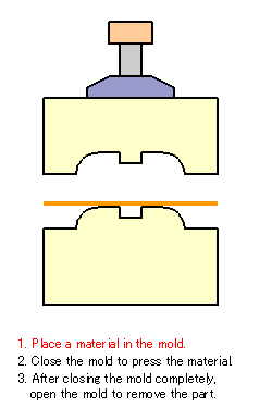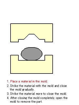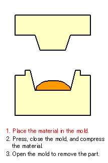 Đóng khuôn trên và sau đó nung nóng khuôn lên và nén khuôn. Sau đó vật liệu sẽ mềm ra và hóa dẻo, điền đầy lòng khuôn.