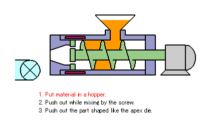 Đặt hạt nhựa vào phễu ( thùng chứa vật liệu trên máy). Sau đó hóa dẻo vật liệu bằng cách trộn nó với trục vít có bộ gia nhiệt. Đùn vật liệu khuôn ra bằng trục vít qua một cái lỗ nhỏ ở đỉnh khuôn ( điều chỉnh thiết bị ra để đưa ra hình dạng của sản phẩm mong muốn).