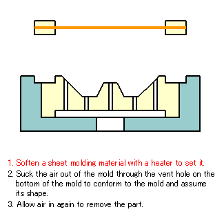Làm mềm nóng một tấm vật liệu đúc với nhiệt độ cao. Tạo lực hút lớn bên dưới biên dạng khuôn, để màng nhựa áp sát vào biên dạng lòng khuôn. Và tạo ra biên dạng sản phẩm theo biên dạng khuôn.