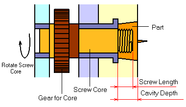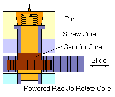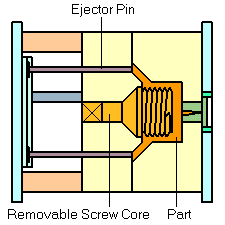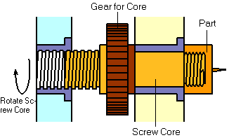 Khi khuôn mở ra, lõi ren sẽ được quay tại vị trí của nó để tháo sản phẩm đúc ra.