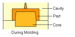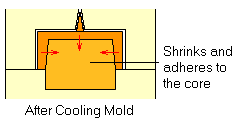 Nhựa nóng chảy được điền đầy vào lòng khuôn, Sau khi làm lạnh và đóng rắn, độ co ngót nhựa xuất hiện. Bởi vì chi tiết bị co lại và dính vào lõi, điều này khó để đẩy chi tiết ra ngoài